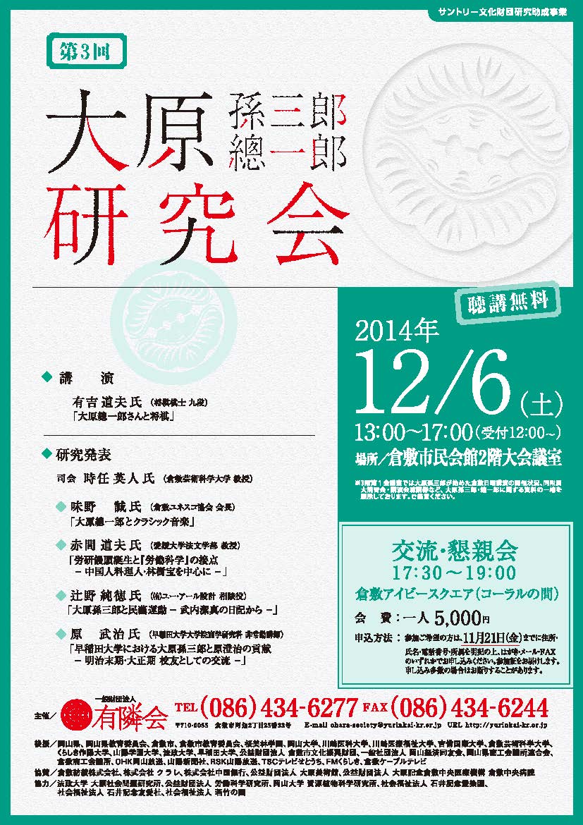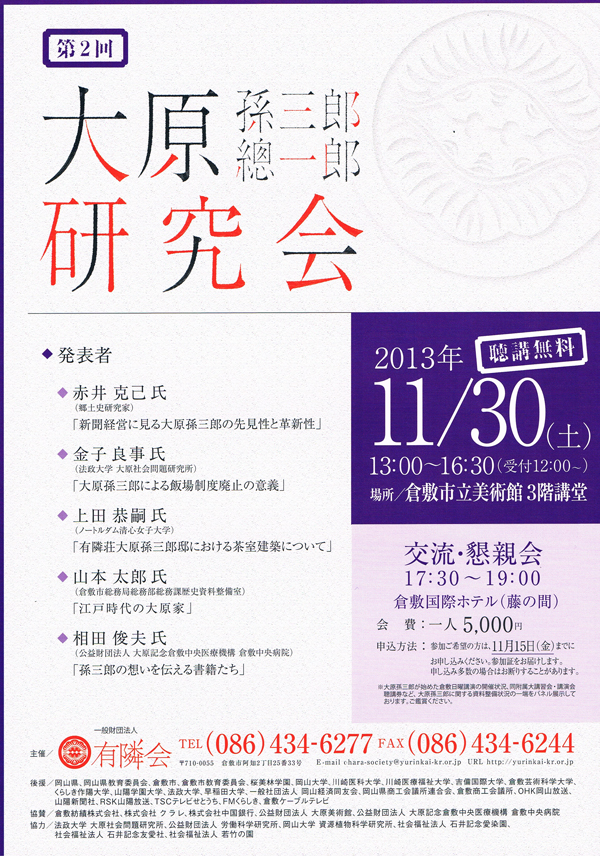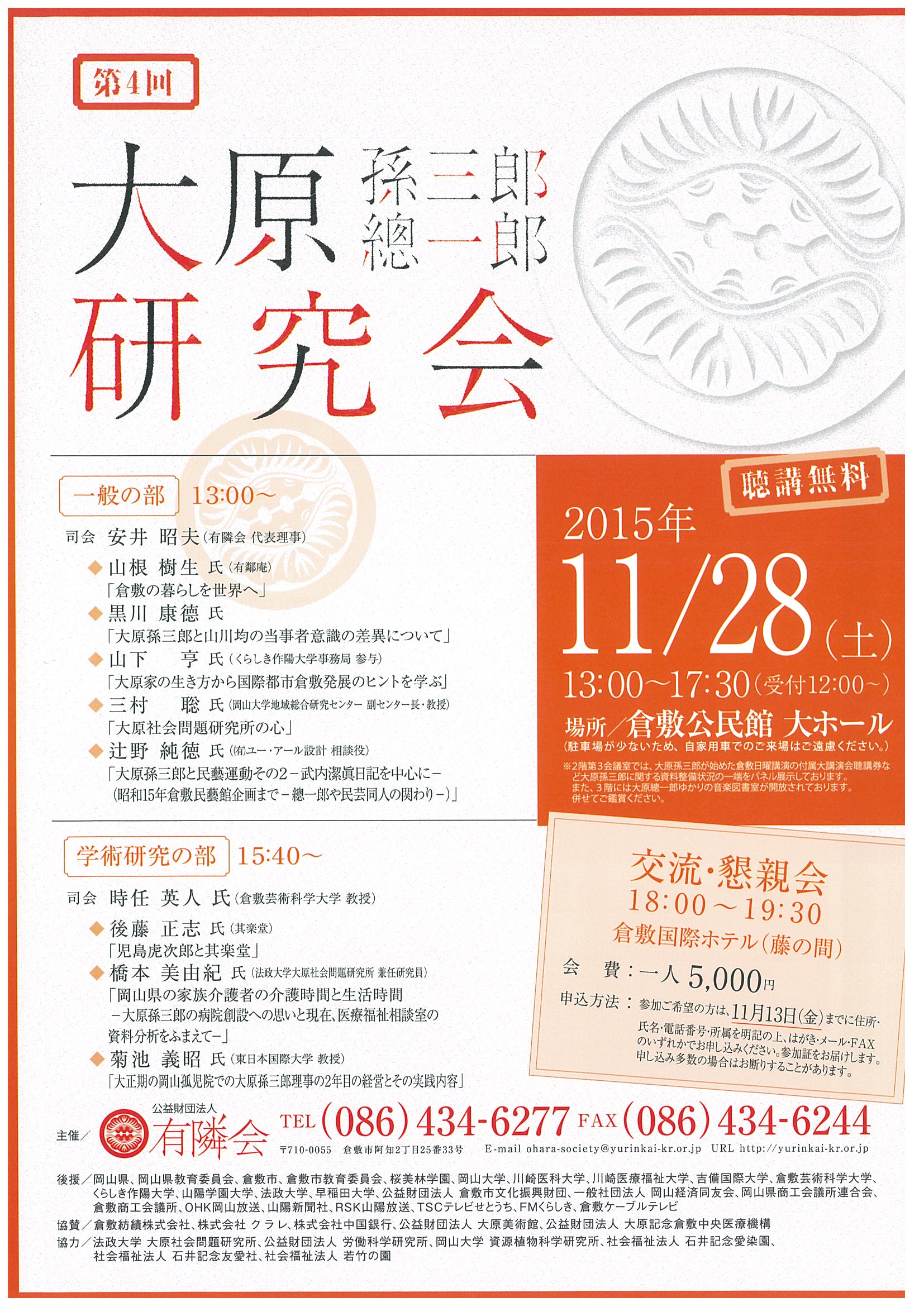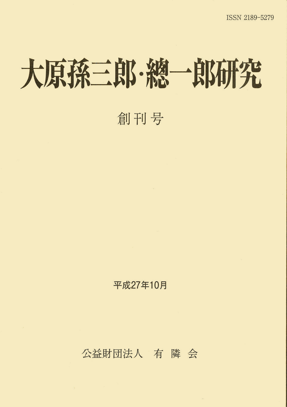 詳細が決まり次第お知らせいたします。 これまでの研究会について 第4回 第3回 第3回研究会PDF 第2回 第2回研究会PDF 第1回・第2回研究会の成果の一部と、 特別寄稿・史料紹介を掲載した紀要を 創刊しました。 頒布価格1,000円。 頒布をご希望の方は、有隣会までお問い合わせください。 目次 【口絵】 「発刊にあたって」大原謙一郎 p.1 【論文】 「江戸時代の大原家」山本太郎 p.5 「大正期の岡山孤児院の大原孫三郎理事の経営手法とその思想(一) ー理事就任前後の経営手法とその思想の内容分析を中心にー」 菊池義昭 p.29 【特別寄稿】 「日本経済・経営史上の思想・実践の確認 」兼田麗子 p.52 【研究ノート】 「孫三郎が蒐集した書籍に関する一考察 」 相田俊夫 柴田洋子 p.62 【史料紹介】 「大原總一郎『資本並に分配の社会化えの試案』を読んで」猪木武徳 p.95 「大原家の出世証文」水島博 p.98 「倉敷日曜公演に関する名士書簡」 林良子 p.113 【再録】 「資本並に分配の社会化えの試案ー社会経済事業の構造的確率ー 」 大原總一郎 p.123 「編集後記」 時任英人 p.142